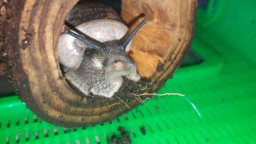 Schnecki hat sich auch zurückgezogen, war deutlich weniger aktiv als sonst, auch nachts hat er nicht viel rumgeschleimt, ging seltener zum Essen. Es war nicht wirklich Trockenruhe, er saß wach in seinem Baumstamm und hat Bewegung auf das Minimum beschränkt.