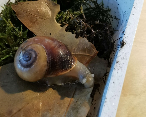 Ich habe die Schnecke in eine kleine Box mit Moos auf ein Blatt gelegt. Für den Fall, dass sie doch Kontakt mit einer schädlichen Substanz hatte, habe ich ihr ein Heilerdebad gemacht und sie etwa 2 Minuten drin liegen gehabt.