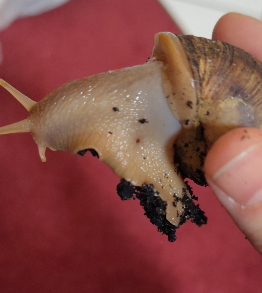 Es ist echt zum Verzweifeln! Heute Morgen hat sich eine von den lucorums seltsam verhalten: Sie hat sich nicht eingebuddelt, sondern ist in einem Bereich zwischen Futterschale und Badeschalen langsam hin und her geschleimt. Irgendwie scheint sie sich nicht wohlzufühlen und sich nicht gut bewegen zu können. Der Fuß am Übergang ins Gehäuse ist ziemlich geschwollen. Ich habe sie dann hochgenommen, um sie genauer zu untersuchen. Sie hat versucht sich einzuziehen, kam aber nicht sehr weit. Sah für mich jedenfalls so aus.