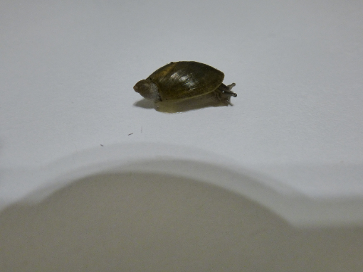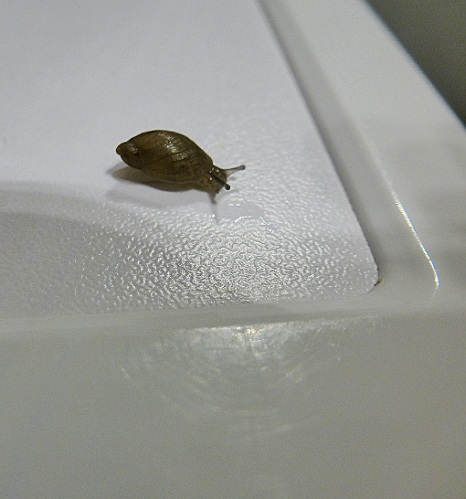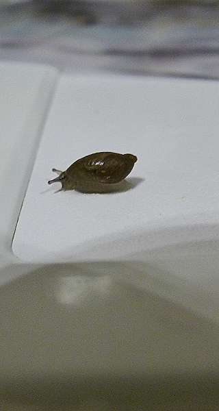 Die Schnecke ist sehr klein, aber mobil. Ich habe sie in eine kleine Dose gesetzt, mit Salatblättern verschiedener Art und mit einer Blumenspritze für Feuchtigkeit gesorgt.