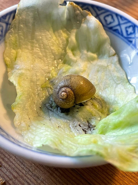 Woher der Salat kam wissen wir leider nicht mehr. Er war anfangs nur ein paar Millimeter groß, mittlerweile hat er ... naja... "normale Schneckengröße" würde ich es nennen.