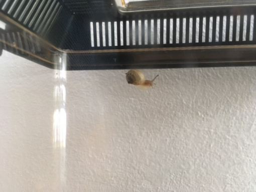Es gab noch eine zweite Schnecke, die aber vor einem Monat nach einem leichten Gehäuseschaden immer inaktiver wurde, bis sie starb und „auslief“. Sie hatte sich am Deckelrand verklebt und ein Teil vom kürzlich erweiterten Gehäuse (sehr dünn) ist beim Aufmachen abgebrochen.