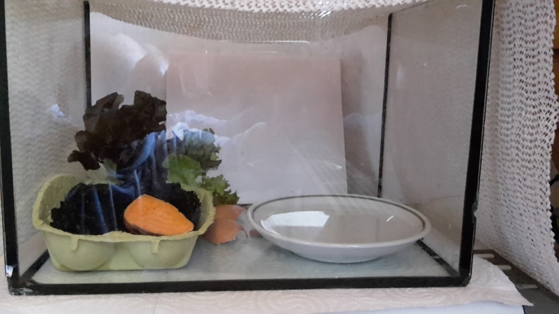 Vor ca. 4 Wochen ist die Schnecke vom kleinen Teller in ein 30 x 20 x 20 Terrarium umgezogen. Bei Wikipedia habe ich gelesen, dass sich Grunzschnecken gern in die Erde eingraben. Ich habe hin und wieder mal eine Schachtel mit Bio-Erde reingestellt, damit sie sich dort verbuddeln kann. Dann war ca. ein Viertel des Terrarium-Bodens quasi mit Erde bedeckt. Die Schnecke denkt aber nicht im entferntesten daran, sich einzubuddeln, geschweige denn auf den Erdhaufen zu kriechen.