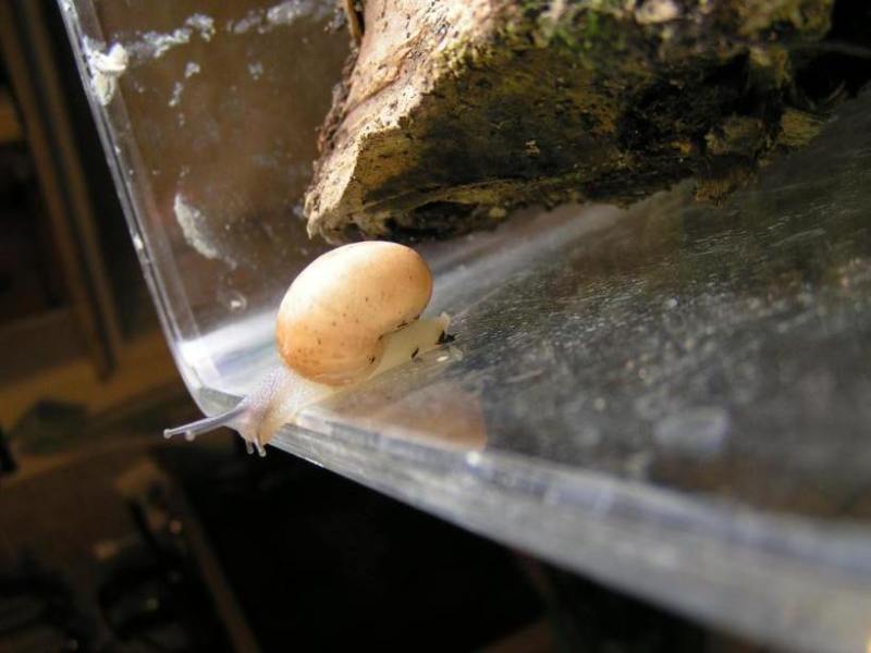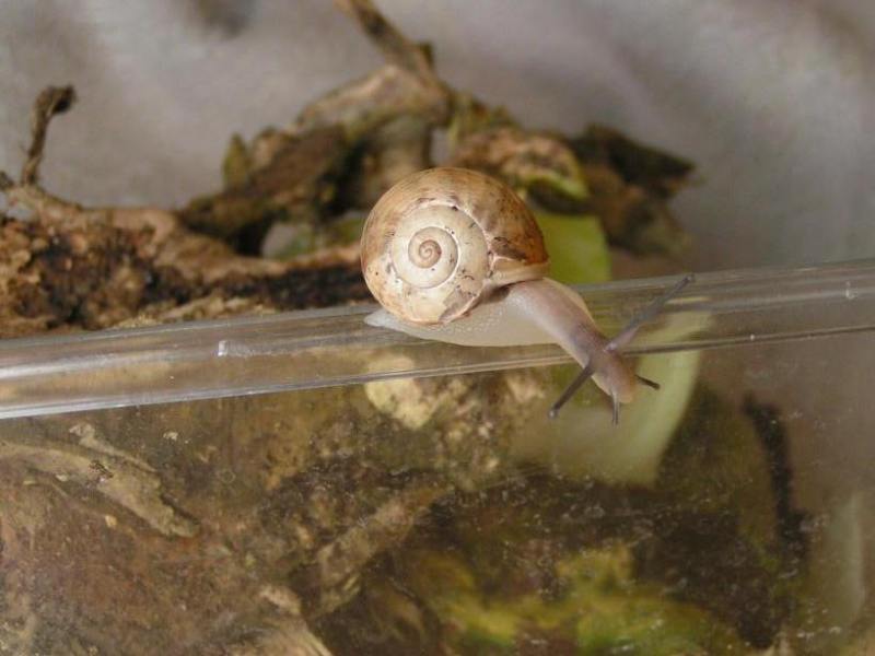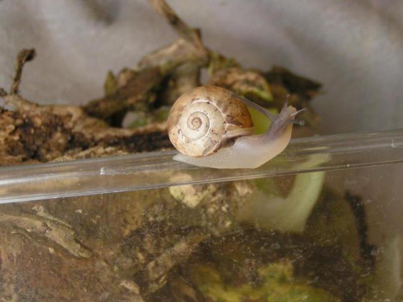 Daheim habe ich sie in einem kleinen Plastik-Transporter für Kleintiere (mit luftdurchlässigem Deckel) untergebracht. Zuerst habe ich nur Erde, Salat und Katzenfutter hineingestellt. Das Katzenfutter nahm sie gern, den Endiviensalat verschmähte sie aber. "Humphrey" blieb von da an bei uns in der Küche. Die Box habe ich immer wieder mit dem Wassersprüher benebelt. Sehr bald fand ich heraus, dass Humphrey verrückt ist nach Eisbergsalat (man konnte richtig zugucken, wie er riesige Löcher hineinfraß) und (haltet Euch fest!) nach Hipp Babygläschen mit Fleischzubereitung (Huhn). Kaum war das an die Plastikwand geschmiert, kam er auch schon angefetzt und fraß sich durch (echt war!). Dann stieß ich auf diese Seite (wollte mehr darüber wissen, was er denn nun eigentlich braucht.). Ich hielt ihn bis dahin für einen stinknormale Gartenbänderschnecke. Doch dann las ich hier von einer "Salatfundschnecke" aus Spanien, die ich auch für eine Schnirkelschnecke gehalten hätte... Doch das war dann wohl eine mediterrane Heideschnecke oder so... Jedenfalls sollte sie lieber nicht hier ausgewildert werden um eine Vermischung der Arten zu vermeiden. Nach dem ich also hier alles nachgelesen habe, was Humphrey wohl so braucht, besorgte ich ihm eine Sepiaschale (denn Kalk hatte er ja nun seit mindestens 2-3 Wochen lang nicht mehr bekommen) und legte ihm verwitterte Wurzeln, Moos und Steine mit Algen dran in seine Box. Er war ganz aus dem Häuschen vor Freude und rührt seitdem keinen Salat und auch kein Babygläschen mehr an! Den ersten Tag saß er fast ständig an der Sepiaschale, nun nur noch gelegentlich. Aber: Heute ist er schon zum zweiten Mal vom Deckel geplumpst. Das erste Mal (vor einer Woche) brach er sich ein Eckchen von der Öffnung ab. Ich hoffte damals, mit der Sepiaschale gelingt ihm die Reparatur selbst. Doch als ich ihn mir nach dem heutigen Sturz ansah stellte ich fest, dass der Außenrand der Häuschenöffnung dünn wie Papier ist. Außerdem ist es wieder an der gleichen Stelle kaputt gegengen, ich trau mich kaum, ihn anzufassen. Seit er bei mir ist, ist er fast auf das Doppelte gewachsen, aber eben alles total dünnhäutig. Wahrscheinlich habe ich alles falsch gemacht!