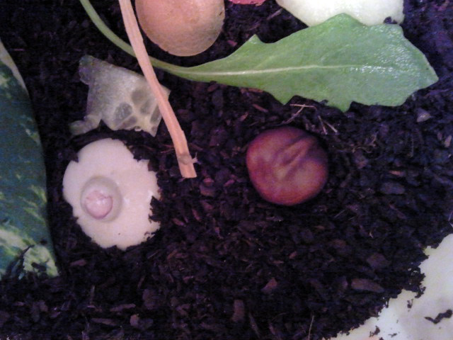 Die Dose ist ziemlich hoch (in Ralation zu den kleinen Kerl)- hab so ca. 3-4 cm erde rein, ein alten kontaktlinsenbehälter als wasserbecken (mit ein paar tröpchen wasser drin und einem stein), das Sepiateil, Gurke, Tomate und Karotte, Eine Kastanie und ein rundes Stück Ton. Die Erde hab ich mit Wasser so von der hand weg ein bissl feucht angespritzt.