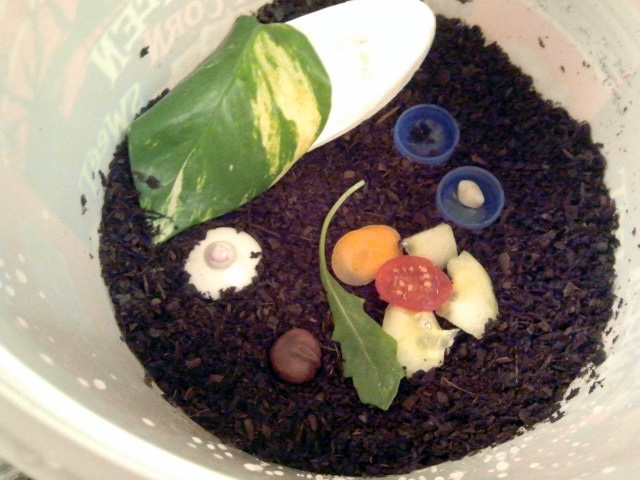 Hab aus der Zoohandlung heute Erde gekauft (Pinienborkenhumus?) und so eine Sepiaschale. Habe eine große Popcorndose genommen und sie versucht Schnecken-gerecht einzurichten. Dort hab ich ihn dann hineingesetzt. Er hat sich dort ein bisschen was angesehen und verweilt nun zwischen einem Stückchen Gurke unter einem Rucolablatt..