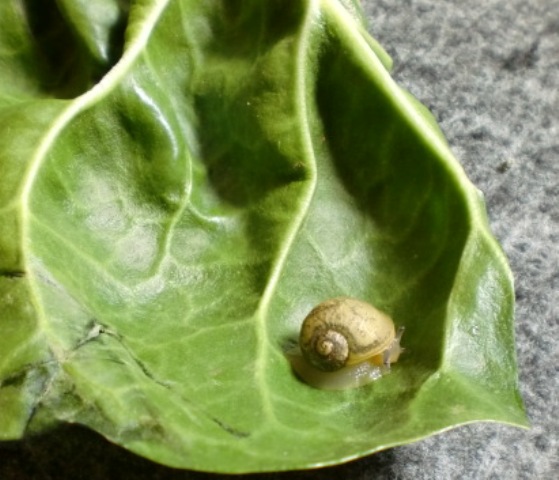. Futterte sich im Mangold im Bio-Laden durch. Nunja ich muß zugeben, dass ich auch die Blätter genau angeschaut habe, weil mir die vielen Löcher und vor allem die frische Schneckenkacke auffielen.Großartig bestimmen brauchen wir hier wohl nicht, denn ich hatte gleich die Vermutung es könnte eine Grunze sein. Oder doch nicht? Komischerweise dachte ich immer, oha, eine Schnecke die Grunzen kann. Ist ja süß. Das aber erst seit drei Tagen und schwupp die wupp ist sie da.