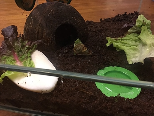Schnecki wohnte anfangs im Gurkenglas mit Salat/Gemüse und Eierschalen. Inzwischen haben wir ihr ein kleines Terrarium (20x20x20) eingerichtet mit: