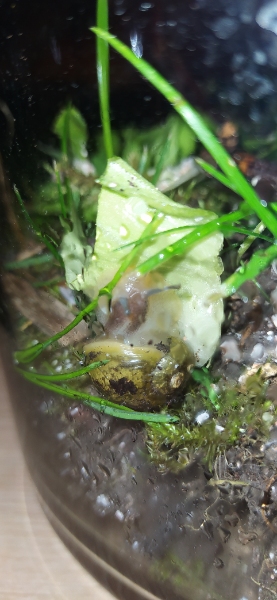 Hallo zusammen, ich habe vor wenigen Wochen eine Schnecke in meinem Bio-Supermarkt mitgekauft. Ich bin eine absolute Schneckenfreundin, aussetzen wollte ich sie nicht, da sie sicher nicht einheimisch ist. Ich vermute, es ist eine gefleckte Weinbergschnecke, ganz sicher bin ich mir aber nicht. Nun habe ich sie vorerst in so einer Art großen Glasvase gehalten, Erde mit Sepiaschalen gemischt, Salatblätter und Gurke hat sie sehr gerne gegessen, kam abends immer aus der Erde zum Fressen und zum Erkunden.