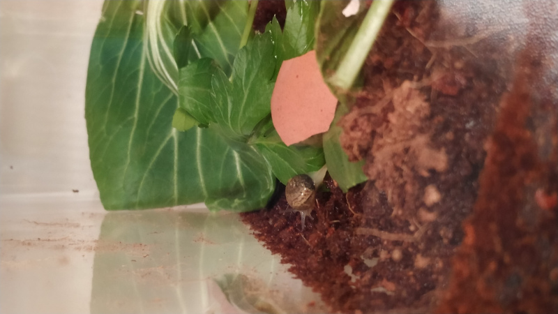 Schnecklinde hat Erde (von einem Hummus-Ziegel - die man mit Wasser aufquellen lässt), eine flache Trinkschale (umgedrehte Untertasse), Eierschalen (abgekocht, von denen sie bisher noch nichts angenommen hat), und natürlich Futter (bisher isst sie nur vom Pak-Choi, aber sie hat auch Karotte, Romana-Salat, Löwenzahnsalat ausliegen).