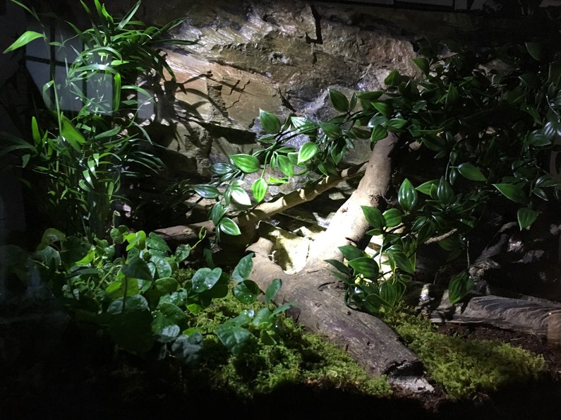 Plötzlich stand ein 72l Aquarium mit Plexiglasdeckel, Kokos-Pinien-Sepia-Gemisch, Moosen, Rinde, sterilgebackenen Ästen und Wurzeln, sowie Pflanzen (Bergpalme und Kletterficus) vor mir. Kleinkram wie Hygrometer, Schalen, Zerstäuber etc. hatte ich bereits, da ich Phasmiden halte.
