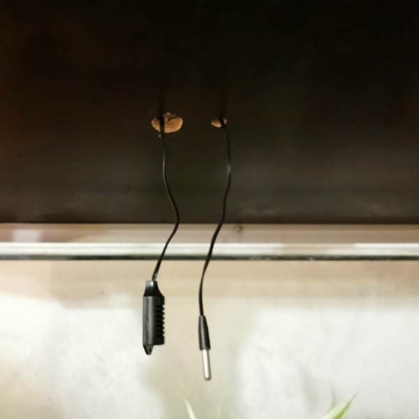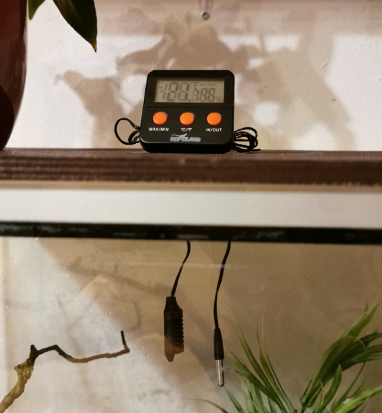 ich habe den Deckel des "großen" Terrariums mittig 2x angebohrt (1x für den Hygrofühler, 1x für den Thermofühler). Die beiden hängen nun einige Zentimeter in die "Schneckenwelt" hinein, es wird sie jedoch nicht stören, denke ich!