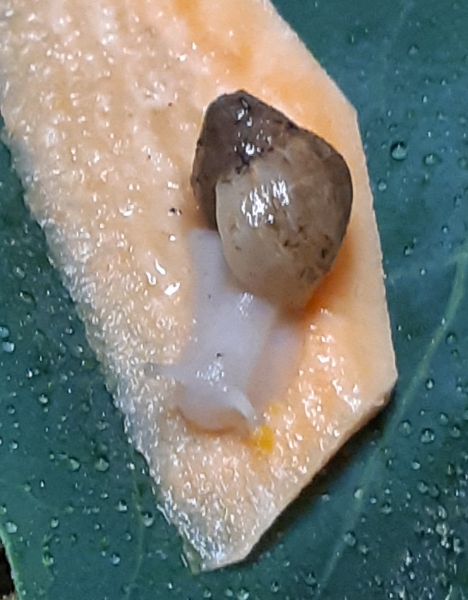 Temperatur liegt bei 25°, Luftfeuchtigkeit 90%.Häuschenlänge 13mm. Futtern tut sie nicht viel. Es ist ständig Sepiaschale, Eierschale (gemahlen und im Stück) und Kalkblöckchen (selbstgemacht) im Terra.