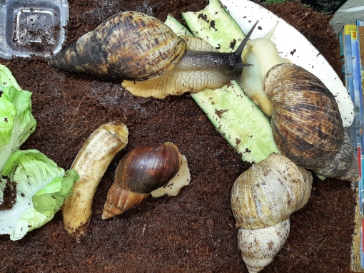 Kurz zur Vorgeschichte: Ich habe seit über 15 Jahren Terrarien mit unterschiedlichem Besatz. Seit 2 Jahren habe ich ein leeres Regenwaldterrarium und war mir unschlüssig, wer sein neuer Bewohner werden soll. Dann stolperten wir bei Ebay Kleinanzeigen über "Achatschnecken mit Terrarium zu verschenken". Coole Sache, könnte passen. Fix grob belesen. Ein Zuhause bringen sie ja erstmal mit und sonst habe ich ja ziemlich viel da. Also, Tierchen angucken. Nun waren wir dort. 4 Schneckis, Terrarium frisch gereinigt, ausgelegt mit Kokosfasern... Nur Kokosfasern... Heizung brauchen sie nicht... Zimmertemperatur reicht... Hygrometer brauchen sie auch nicht, einfach ab und an mal sprühen reicht... Welche Art? Naja, Schnecken... Achatschnecken, um genau zu sein... Gefüttert mit Salat und Gurke. Wir haben sie dann mal mitgenommen...