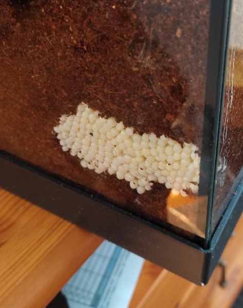 Schnecken behalten die Eier unterschiedlich lange im Körper, insofern kann man das nie so genau sagen... Aber wahrscheinlich haben sie sich ja auch vorher schonmal gepaart Bevor sie legefertig sind kann man sie aber durchs Atemloch sehen