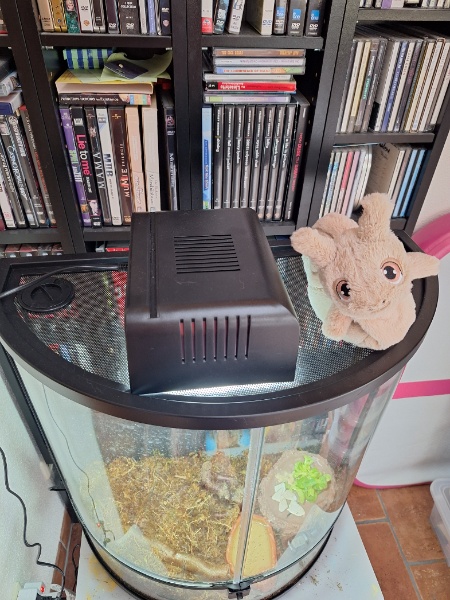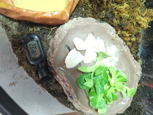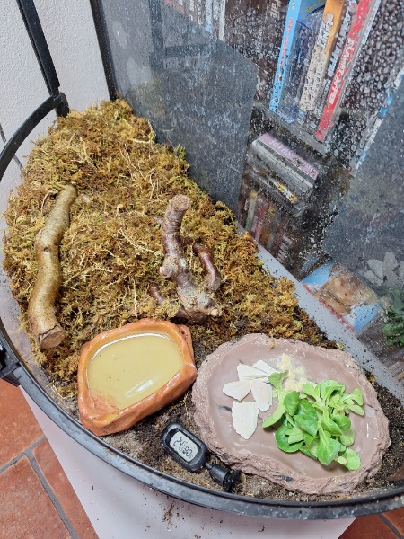 Wir haben die Tiere dann gesucht, weil wir sichergehen wollten, dass sie nicht tot sind. Sie fraßen dann (Vogerlsalat) und haben sich wieder verkrochen. Wir waren dann erneut in der Zoohandlung und haben eine weitere Heizmatte gekauft, da die Temperatur nicht über 22° kam. Jetzt haben wir eine weitere Heizmatte gekauft mit 16W (haben jetzt insgesamt 24W) und eine stabile Wärme zwischen 24 und 27 Grad. Die Luftfeuchtigkeit ist zwischen 70% - 90%).