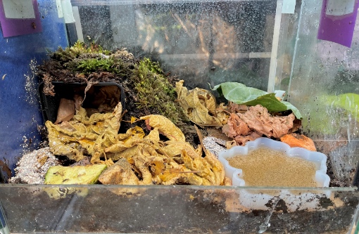 Wir haben die Tiere dann gesucht, weil wir sichergehen wollten, dass sie nicht tot sind. Sie fraßen dann (Vogerlsalat) und haben sich wieder verkrochen. Wir waren dann erneut in der Zoohandlung und haben eine weitere Heizmatte gekauft, da die Temperatur nicht über 22° kam. Jetzt haben wir eine weitere Heizmatte gekauft mit 16W (haben jetzt insgesamt 24W) und eine stabile Wärme zwischen 24 und 27 Grad. Die Luftfeuchtigkeit ist zwischen 70% - 90%).