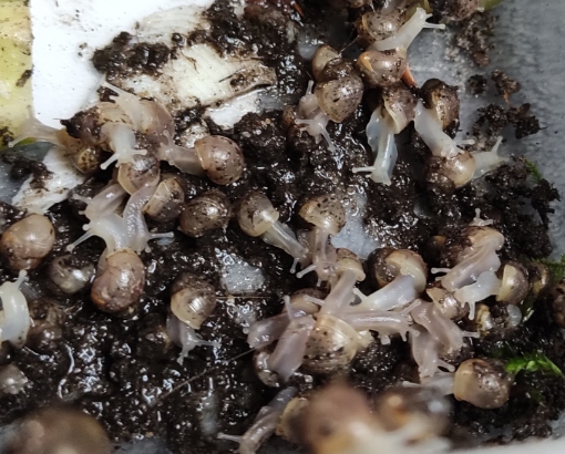 Bei uns läuft es ganz gut, wir haben Notfall-Schnecken übernommen und beim Saubermachen im Terrarium diese 7 Schnecken gefunden, die gerade aus dem Ei schlüpften.