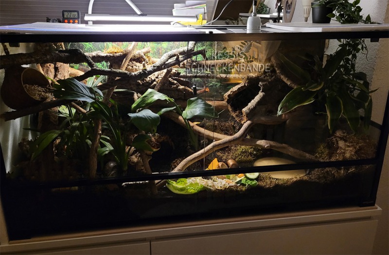 Ich verwende ebenfalls den Thermo Control PRO II mit einer Elstein „Lampe“ mit Schutzkorb. Läuft hier sehr zuverlässig und ich bin zufrieden damit.Direkt unter dem Strahler trocknet die Erde schnell aus, da muss man etwas aufpassen. Ich habe jetzt unterm Strahler Moos, das jeden Tag „baden“ geht. So bleibt die Erde drunter feucht und mit der Luftfeuchtigkeit geht sich so auch gut aus.