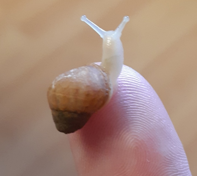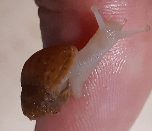 Schildi wächst prima. Sie hat schon fast eine halbe Häuschenumdrehung hingelegt. Ich bin echt glücklich. Auch sieht sie nicht mehr so "verdreht" aus. Das Häuschen sieht aber irgendwie "bauchig" aus. Aber sie ist munter und schneckt durchs Becken. Mal an der Wand, mal an der Decke und manchmal auch eingebudelt. Alles in allem bin ich zufrieden und freu mich total