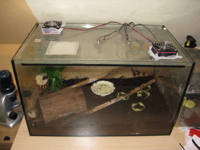 ,ich will mir nächstes Jahr Achatschnecken anschaffen. Mein "Terra" ist 60x40x40cm groß. Oben ein Gitter mit Gitterabstand von 5mm und an der öffnung Abstand von 1cm. Und an einer Seite ist ein Lüftungsschach. Also die Schnecke muss da schon etwas grösser sein