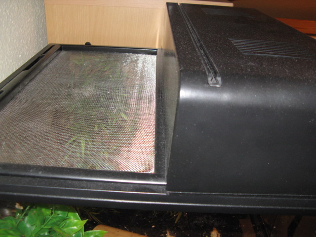 Ein anderes Terrarium mit Gitter (tagsüber der Luftfeuchtigkeit wegen abgedeckt)