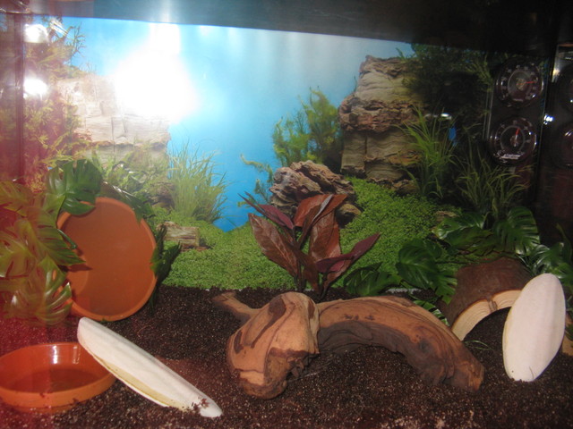 Als Einrichtung hab ich einen kleinen halben Holztunnel, einen kleinen Terakotta Topf, eine Wurzel (da hab ich aber auch Angst, können sie sich da nicht verletzen?), zwei Kunstpflanzen, einen kleinen Futternapf und Sepia natürlich.