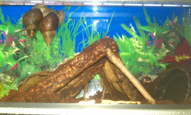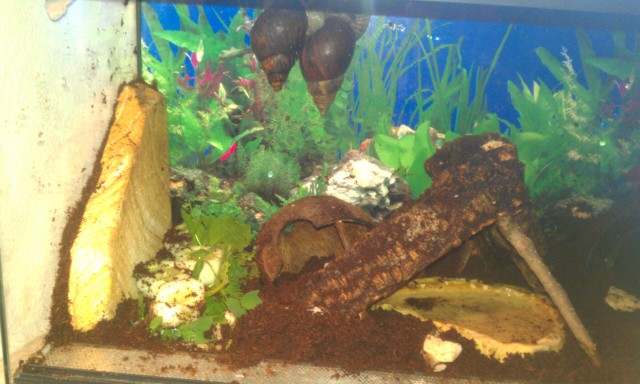 Ich habe immer 23-25 grad und zwischen 80 und 90 sagt das Hygrometer. Ich besitze zusätzlich noch 2 Vogelspinnen und das mit der Temperatur und der Luftfeuchtigkeit dürfte desshalb kein Problem darstellen. Ausserdem habe ich eine Sepiaschale zerbrochen überall in 1-2 cm großen Stücken im Terrarium verteilt. Cocosbrikett (Das selbe benutze ich bei der Vogelspinne) meinte der Verkäufer ist super. Auf der linken Seite habe ich Kies hingelegt, jedoch nur damit das Essen nicht immer dreckig wird. Ich werde es natürlich immer mit Essen bedecken, damit sich eine eventuell runterfallende Schnecke nicht wehtuen kann. Der Dicke Stein ganz links war eher ein Fehlkauf, jedoch finde ich das er schön aussieht. Ich habe über das Wasserbecken so Korkrinden gebaut, damit falls die Schnecken runterfallen sie sich nicht an dem Rand des Beckens wehtuen.