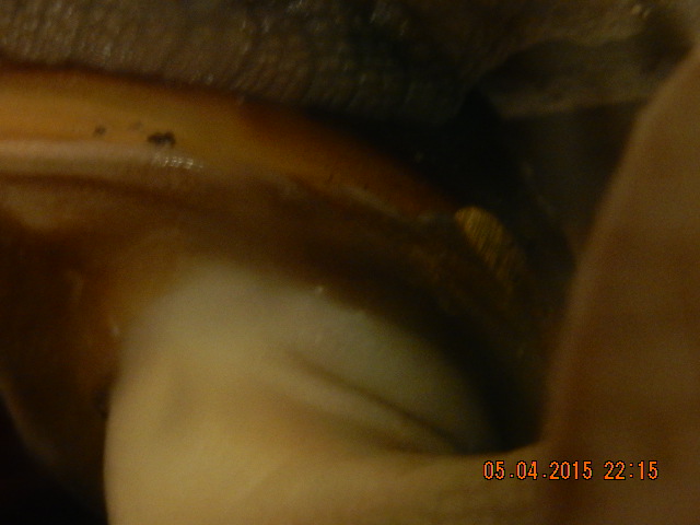 Das ist der Schaden von der Seite gesehen - er befindet sich auf der rechten Seite des Häuschens, in der Nähe vom Atemloch, und es hängt etwas geleeartiges dran: