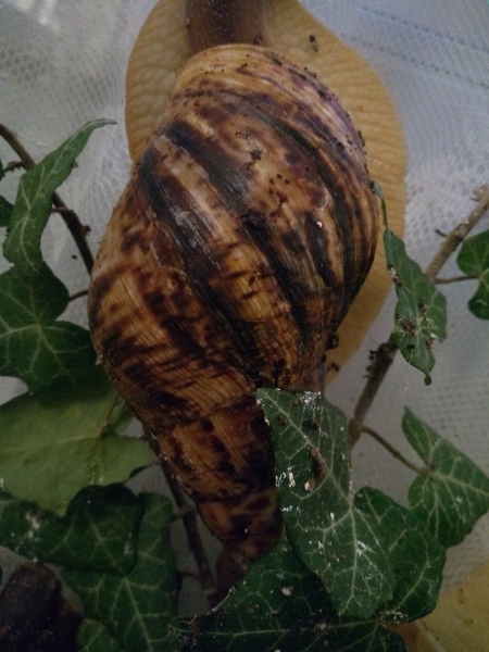 Das wars vorerst. Wie gesagt, die Schneckis sind ca. 9 Monate alt, zwischen 10 und 14cm lang. Das Terrarium ist 80x40x50cm groß (wobei ich ihnen ein größeres kaufen werde, sollten sie noch viel wachsen), sie haben Klettermöglichkeiten, Verstecke (wo sie lieber drauf als drinsitzen), Efeu und Plastikpflanzen, eine Wasserschale und bekommen täglich frisches Gemüse zum Fressen.
