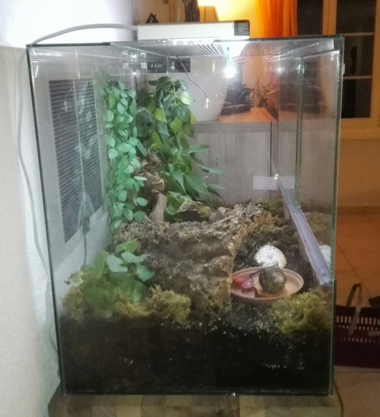 Einrichtung: 2x echter Efeu, 1x Einblatt echt, 2x kunstpflanze hängend, mangovenwurzel (hoff das schreib ich jetzt richtig), Rindenröhre, Moos, Wasserschale plastik, Futterschale aus Plastik (blumentopf untersetzer), Sepiaschale abgekocht