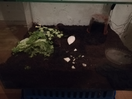 Im Terrarium hatten sie aufgekalkte Bio-Blumenerde, da ich aber gelesen habe, dass sie lieber Kokoshumus mögen, habe ich den nun ins neue Zuhause gepackt, natürlich aufgekalkt. Auch eine Sepiaschale liegt immer drin. Ich weiß grad nicht ob ich was falsch gemacht hab, oder ihnen die Erde vlt doch nicht passt. Oder sogar das Aquarium :s