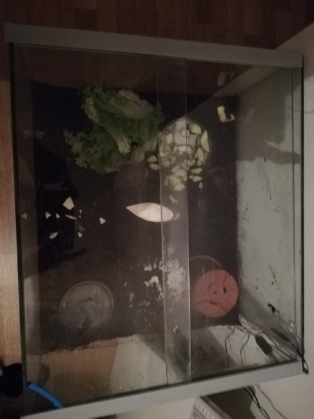 Ich halte sie in einem Aquarium, in welchem vor Jahren mal Schildkröten gehalten wurden (habe es natürlich gereinigt, aber nur mit Wasser, da man ja keine Putzmittel verwenden soll). Momentan hat es relativ konstante 23 Grad, ein bisschen kühler in der Nacht. Luftfeuchtigkeit ist momentan bei 96% was ich nicht ganz verstehe, weil sie sich auch nicht merklich verändert, wenn ich das Aquarium ne Zeit lang offen hab, aber ja. Dachte besser hohe Luftfeuchte als zu wenig. Im alten Terrarium waren Temp und LF sehr instabil, weil der Standort anders und es dort heißer war, weswegen ich sie überhaupt in ein anderes Zimmer gestellt habe, wo dann sogar Gary zufrieden schien.