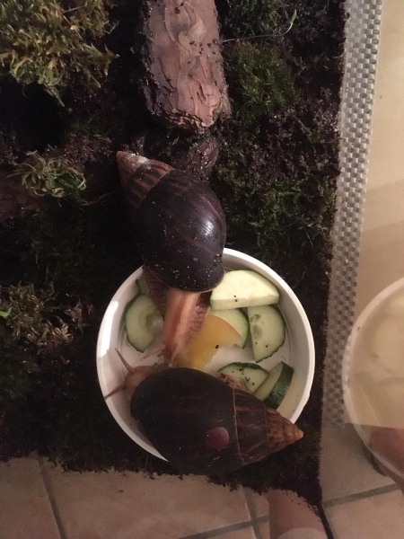 Ich würde dann ziemlich sicher sagen, dass es Lissachatina Immaculata Immaculata sind, 26/27°C Tags, 23°C nachts und 80%LF, sie kommen ursprünglich aus Südafrika und halten eine mehrmonatige Trockenruhe.