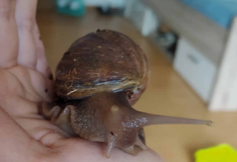 Setze sie unbedingt erstmal in eine flache Wasserschale und biete ihr viel Gurken und zB Brei aus Fischfutterflocken oder Banane mit Mehl und Wasser an. Sie benötigt unbedingt Flüssigkeit und viel Energie, vielleicht kannst du es noch schaffen, ihr zu helfen. Leider scheint ihr bisheriges Leben unter sehr schlechten Bedingungen abgelaufen zu sein, ihr Gehäuse hat viele Rillen und ihr Fuß zeigt mehrere Verletzungen auf, noch dazu ist sie eben sehr abgemagert und verfärbt (Anzeichen einer Dehydrierung). Ich wünsche dir und der Schnecke das beste und hoffe, du kannst sie noch retten!