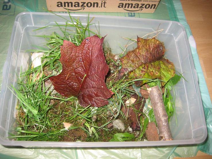 1.) Ich habe Eierschalen reingelegt, alte nicht mehr bewohnte Schneckenhäuser gesammelt und zermalen und ihr hineingegeben, damit sie ihren Kalkbedarf decken kann. Weiter bekommt sie alte Blätter, Gras etc. (siehe Bilder) Was brauchen Sie noch?