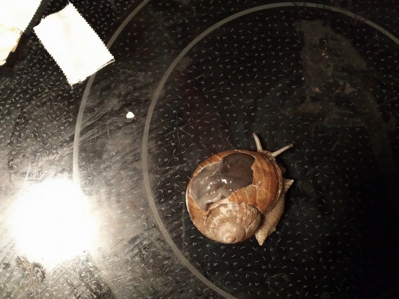 Die Schnecke macht einen vitalen Eindruck und kriecht herum. Im Moment ist sie in einem ausgedienten 30l-Aquarium mit feuchten Zewas, einem Kalkstein, den zerkleinerten Resten des leeren Schneckenhauses und zwei kleinen Kohlrabiblättern.