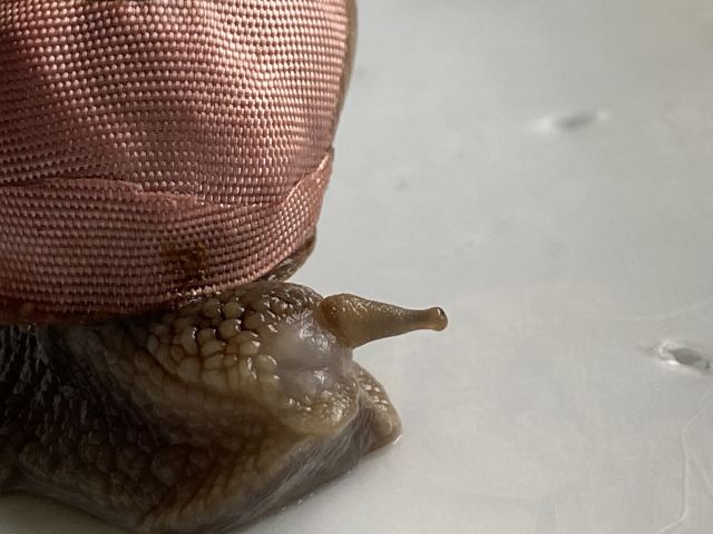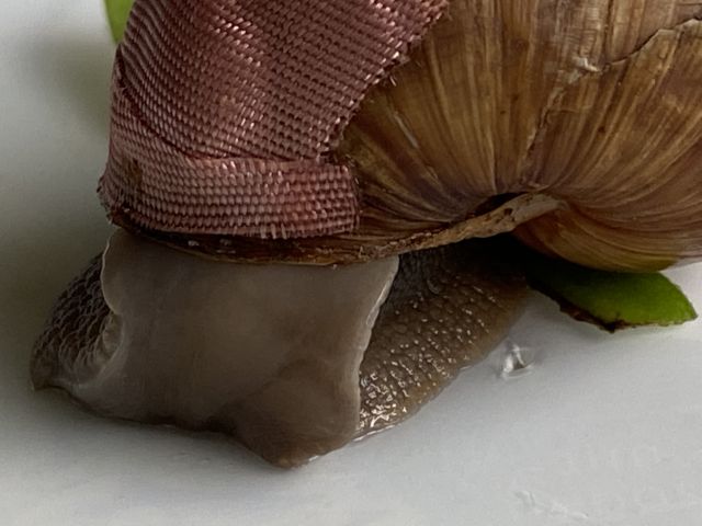 Ich habe sie reingeholt um das Loch mit Folie und Leukoplast zu verschließen. Kurzzeitig kam die Schnecke zum Vorschein, und ich konnte sehen, dass ihr ein Fühler fehlt.