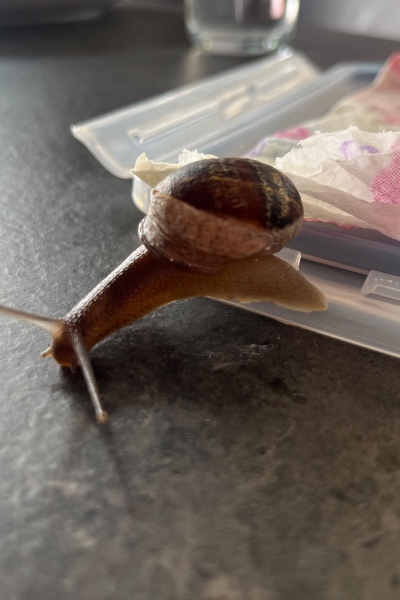 Bisher sitzt Schneckbert geschützt in einer Tupperdose mit Luftzufuhr auf feuchtem Zewa, ich wechsel täglich alles darin: frischer Löwenzahn, Gurke und anderes Gemüse wie Kohlblätter, Salat, Erdbeeren, etc..