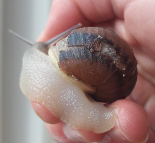 An Tag 1 hat das Gehäuse schlimmer ausgesehen mit mehreren losen Teilen, die ich nur versucht habe wieder an den richtigen Ort zu schieben, ohne was darunter zu beschädigen, hat meiner Meinung nach gut funktioniert. Sie wurde in einer großen Tupperbox untergebracht, 1 bis 2 mal täglich mit Leitungswasser besprüht, abgedeckt mit einer Plastikfolie mit Luftlöchern darin, unter Zimmertemperatur untergebracht. Unten feuchte Erde, darüber eine Mischung asu Gras, Wiesenkräutern, Laub, und Futter, das ich verteilt habe (geraspelte Karotte, extrem schmal geschnittener Apfel, Birne, Tomate, dann Brokkoliblätter, Karottengrün, Fenchelgrün). Davon hat sie eigentlich nur Karotte, ein bisschen Apfel gegessen. Schön geformten Kot jeden Tag abgesetzt. Habt ihr noch Futtertipps?