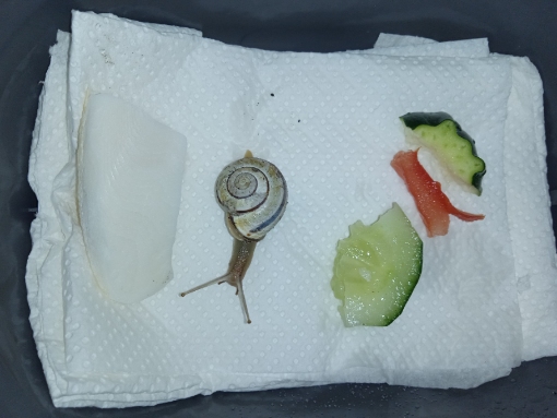 grade beim Futterwechsel fand ich meine Hain-Bänderschnecke Vanille so vor. Sie sitzt grade schön brav an der Sepiaschale. Heute morgen war das glaub ich noch nicht so.