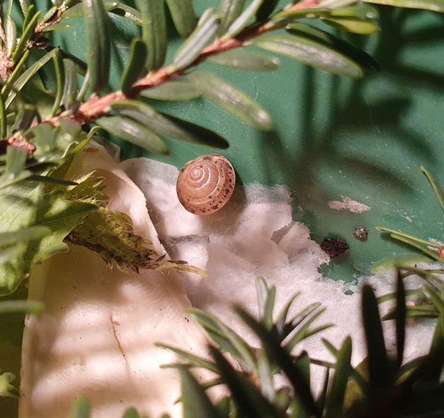 Inzwischen habe ich ihr auch noch einige Blätter und Ästchen rein gegeben, die sie gerne beklettert um sich an der Unterseite festzuhängen... oder sie hängt oben am Klarsichtdeckel ... Und ich habe ihr eine Sepiaschale für die Kalkzufuhr gekauft. ...