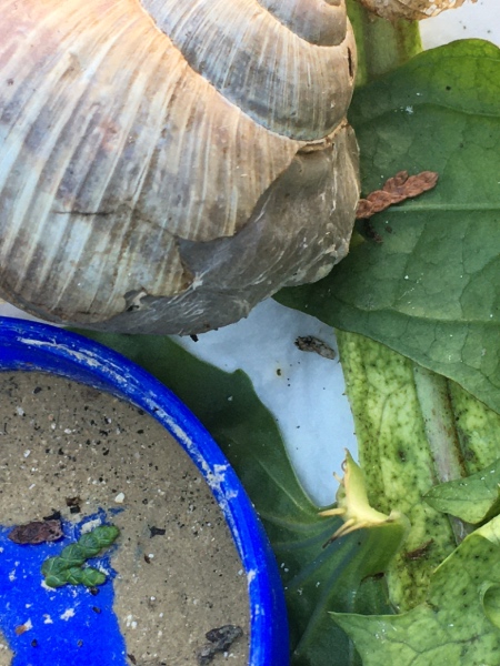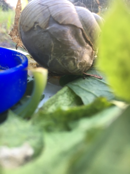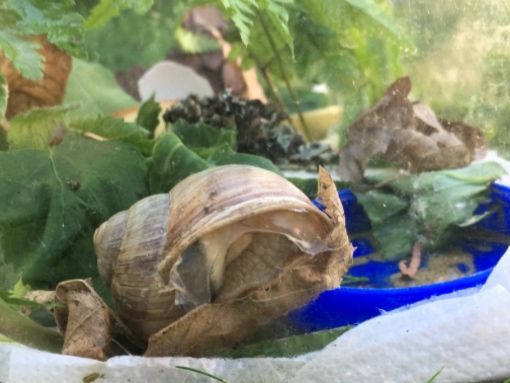 So, viel Neues von der Schnecke gibt es nicht: Sie ist immer noch an der Scheibe angeheftet, heute noch etwas mehr zurückgezogen, es ist auch der heißeste Tag.