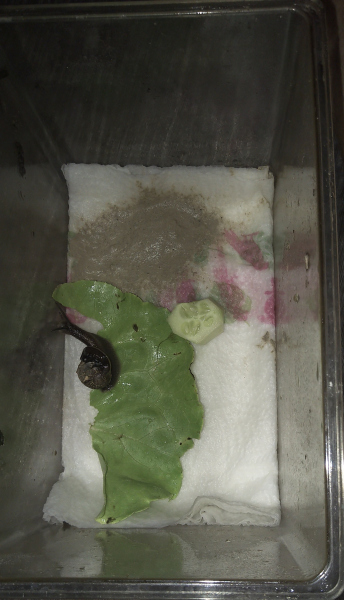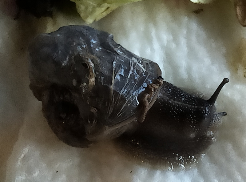 Der Patient ist seit gestern Abend bei mir. Der Transport verlief problemlos, mit einiger Geduld auch das anschließende Umsetzen in sein neues Zuhause (ich habe ihn mit einem Salatblatt angelockt und selbst kriechen lassen). Die Verletzungen sind sehr schwer, das steht außer Frage. Je nach Körperhaltung kann man sogar das Herz pulsieren sehen. Vielleicht war das der Knubbel? Der kleine Uli (habe mal "U" als Vorgabe genommen und mir erlaubt, ihm einen "richtigen" Vornamen zu geben) ist ziemlich tapfer, er frisst Salat, reagiert auf Feuchtigkeit und Licht, kriecht herum. Momentan sitzt er in einer oberen Ecke seines Terrariums. Hätte man ihn mir frisch verunfallt übergeben, hätte ich versucht Gehäusereste wieder anzukleben, wäre da ehrlich gesagt von einer Überlebenschance von 5% ausgegangen. Da er schon eine Woche durchhält und recht gut beieinander ist, habe ich aber große Hoffnung, dass er durchkommt. Vom Gehäuse ist nur noch ein kleiner Rest vorhanden, etwa 25-30%. Der Weichkörper scheint jedoch völlig unverletzt. Ich tue alles, damit er durchkommt.