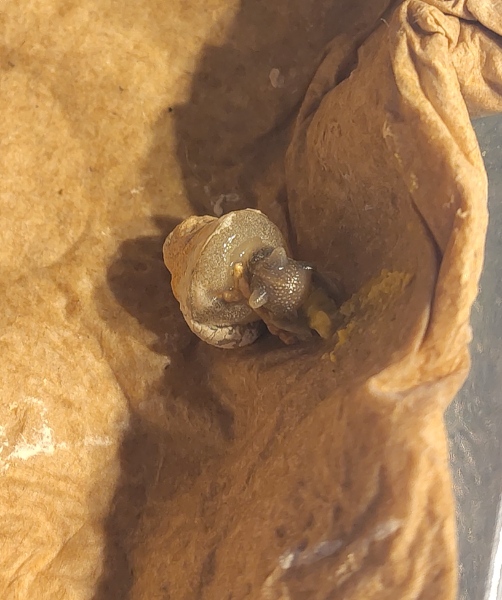 Was seltsam ist: Der Eischnee von gestern ist fast komplett verschwunden! Dafür kommt mir der Mantelsack/Rest? aufgequollener vor? Kann sie es aufgenommen haben? Aber wie? Das war ja schon beim Festwerden, als ich sie wieder reingesetzt habe. Sie ist zwar über Nacht dann tatsächlich rumgefallen und hat sich wieder umgedreht. Theoretisch könnte sie es also wieder abgestreift haben, aber dann an seltsamen Stellen und ohne Spuren auf dem Küchenpapier... Es waren wirklich nur noch an einigen wenigen Stellen Reste eingetrockneten Eischnees zu sehen. Der große Rest sah aus wie die Tage vorher auch. Beim Brei vorher ist mir das auch schon aufgefallen, dass sie sich ja weite Teile des Mantelsacks eingeschmiert hatte, aber man nachher nicht mehr viel davon dah am nächsten Tag. ¯\_(ツ)_/