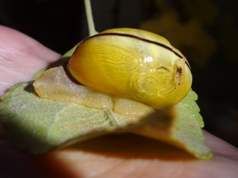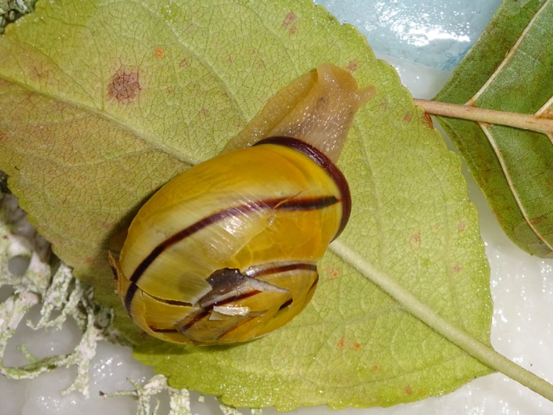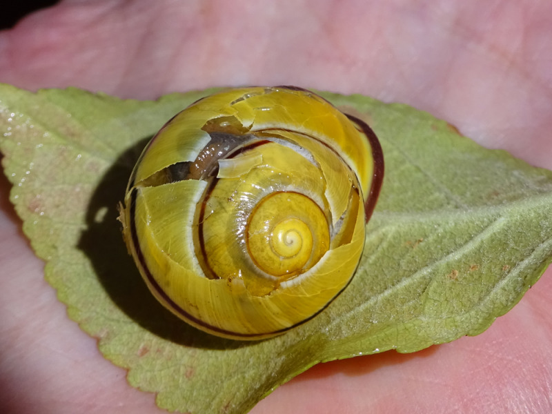 Die nächste habe ich gestern beim Fegen gefunden, eingeklemmt zwischen Treppe und Hauswand. Sie hat ein kleines Loch in der Nähe der Mündung und hatte sich ganz weit ins Haus zurückgezogen und hinter dem Loch eingekapselt. Keine Ahnung wie lange sie so da drin war, und ich war auch nicht sicher, ob sie noch lebt. Drinnen auf dem feuchten Küchenpapier ist sie dann nach einer Weile rausgekommen. Sie sieht unheimlich klein für das Haus aus. Keine Ahnung ob das normal ist.