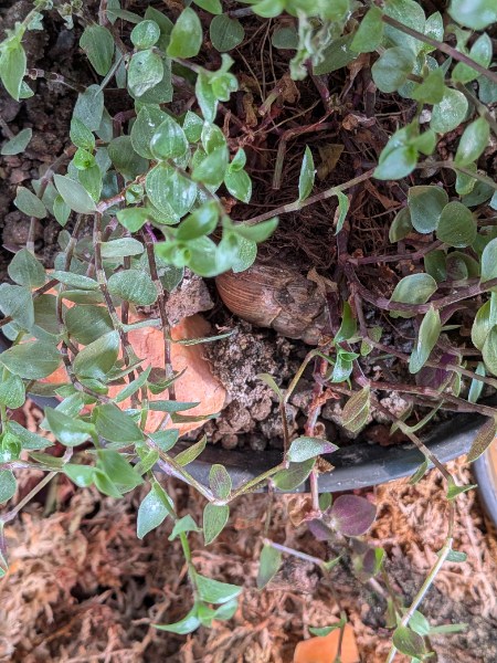 Beamy ist seit circa zwei Wochen halb in einem der Pflanzentöpfe eingegraben. Ab und zu sieht man mal ganz wenig vom Fuss, und neulich hat er auch mal einen Fühler rausgestreckt. Da er nicht eingekapselt ist, frag ich mich natürlich, wie lange er so überdauern kann. Ich lege seit einer Weile Süsskartoffel und Löwenzahn neben ihn, für den Fall, dass er dringend etwas braucht, aber genommen hat er bisher nichts.