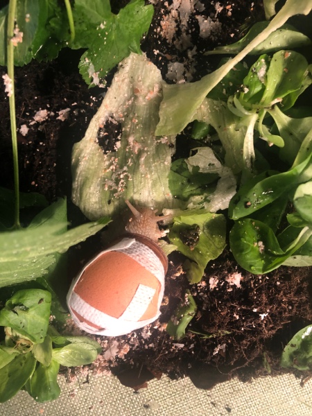 Sie scheint nicht verletzt zu sein, ist agil und frisst. Jetzt habe ich nach bestem Gewissen und nach den Einträgen von euch wie man ein Schneckenhaus unterstützt - das so stark beschädigt ist - gehandelt und sie mit Eierschalen und Leukoplast repariert. Anbei die Bilder!