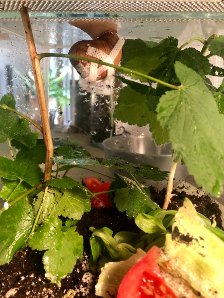 Wir haben ein Terrarium, zwei weitere kleine Weinbergschnecken sind schon drin. Einmal Gundula - die fsst geheilt ist und Daisy als Sozialkontakt. Blumenerde und Rindenmulch sowie Äste, Kalk in Form von gemörtelten Eierschalen sowie eine Schale Heilerdenpampe und Salat sowie eine Erdbeere sind gerade die Grundausstattung.