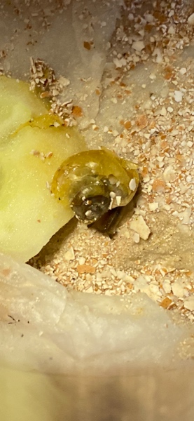 Sie sitzt auf feuchtem Zewa und hat zerriebene Eierschale (hat sie schon echt viel von weggemampft) und Gurke sowie Haselblätter zum Verstecken.